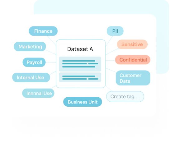 Create custom tags, business-friendly categories, and classifications to organize your assets the way your teams understand them whether by department, sensitivity, or business unit.
