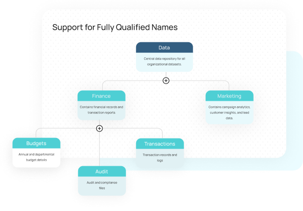 Every data asset in DatazenX is assigned a Fully Qualified Name including database, schema, table, and column ensuring complete uniqueness and clarity across your catalog.
