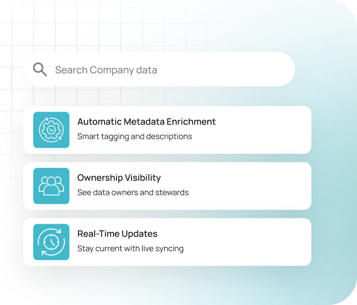 Create a unified, searchable data catalog with automatic metadata enrichment, ownership visibility, and real-time updates, all in one platform.